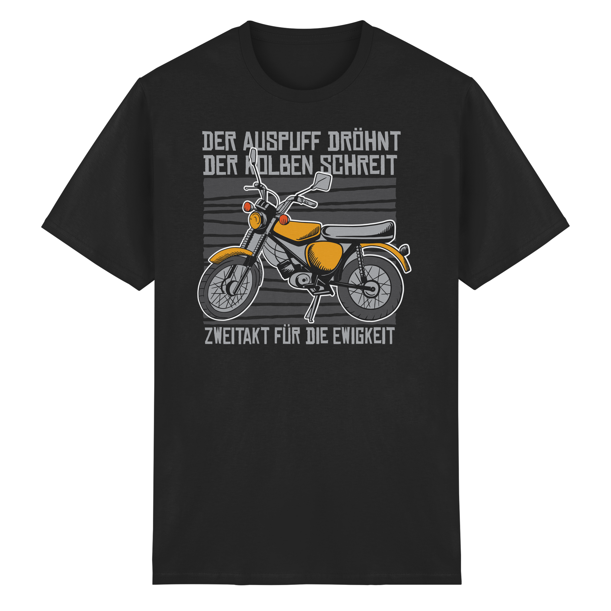 Mit dem Spruch „Der Auspuff dröhnt, der Kolben schreit – Zweitakt für die Ewigkeit“ zeigst du deine Leidenschaft für Ost-Mopeds, Schrauber-Kultur und Zweitaktmotoren. Egal ob Oldtimer-Treffen, Schrauberkeller oder Biker-Event, dieses Shirt ist ein Statement für alle, die den Sound und Charme der DDR-Zweitakter lieben.
